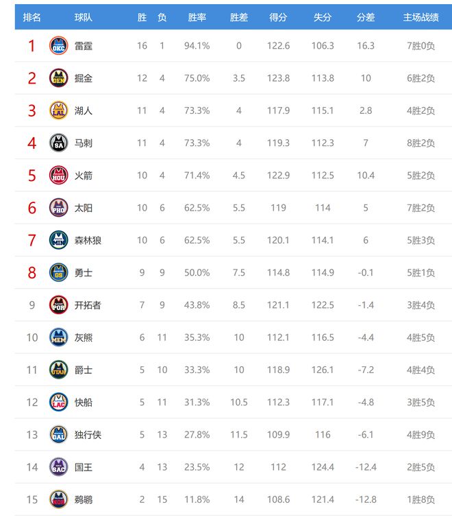 今日比賽后灰熊、爵士排名互換,其他西部球隊排名不變。